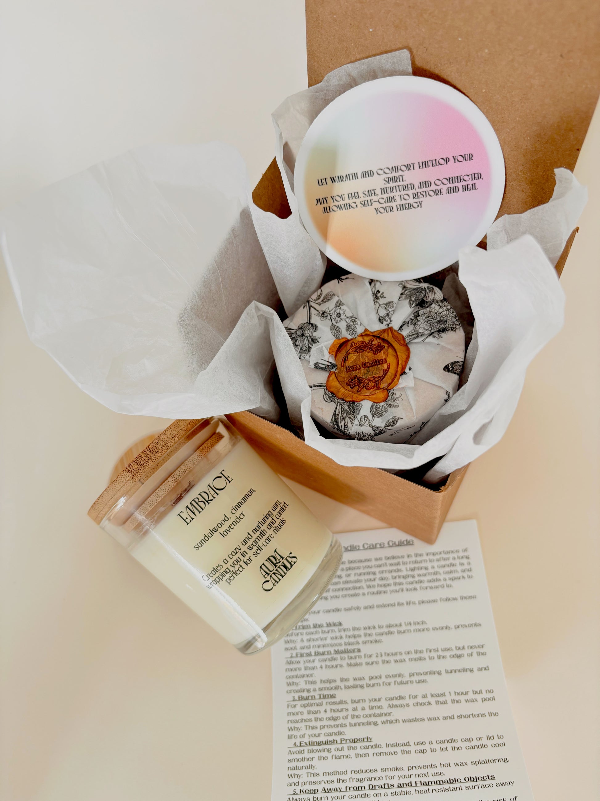 Wrap yourself in the warm comfort of Embrace, a cozy blend of sandalwood, cinnamon, and lavender.