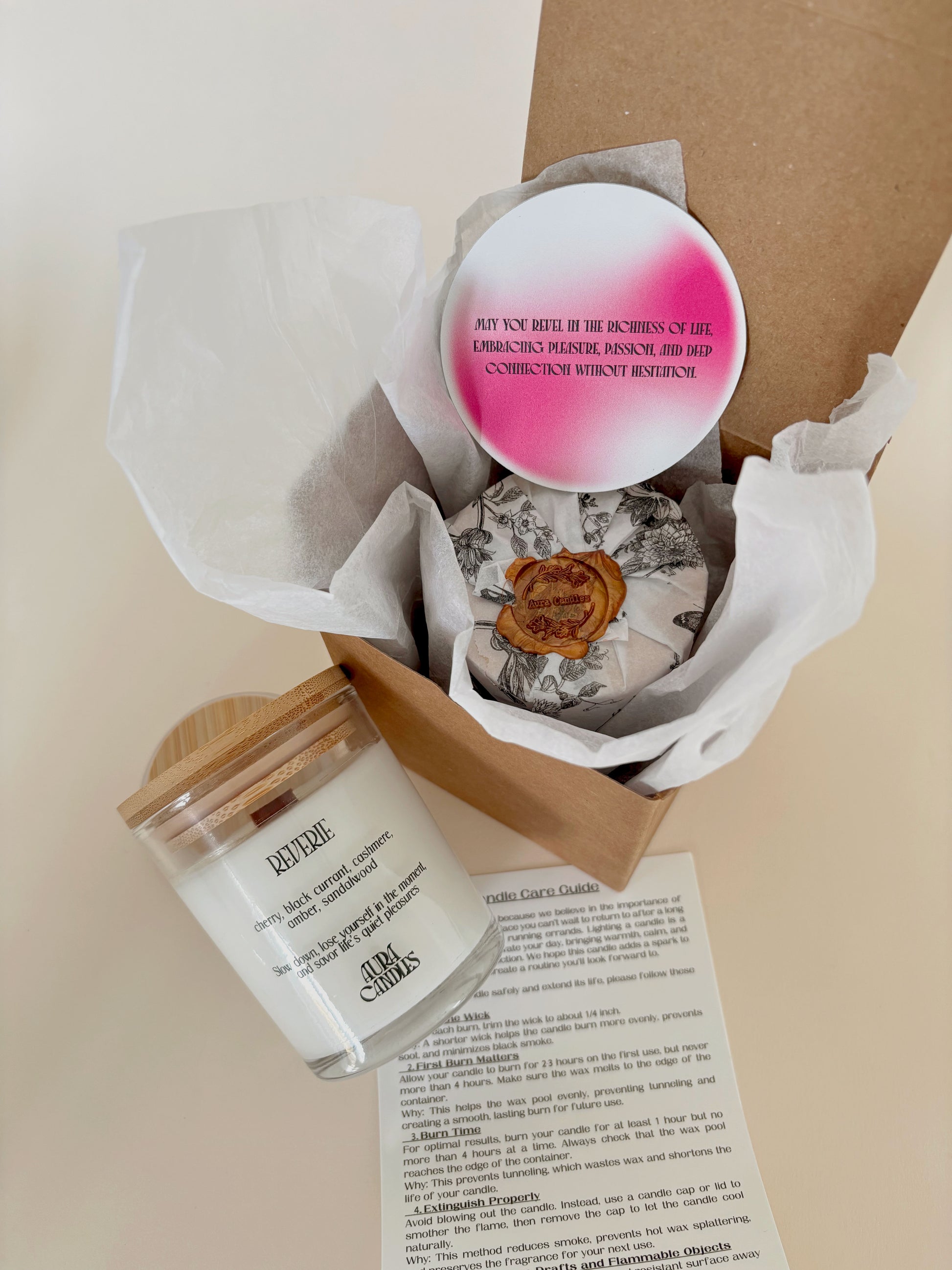 Drift into a dreamy escape with Reverie, a rich blend of cherry, black currant, amber, and cashmere. Poured with apricot coco soy wax and finished with a crackling wooden wick, this candle brings 30–35 hours of cozy, fragrant glow.